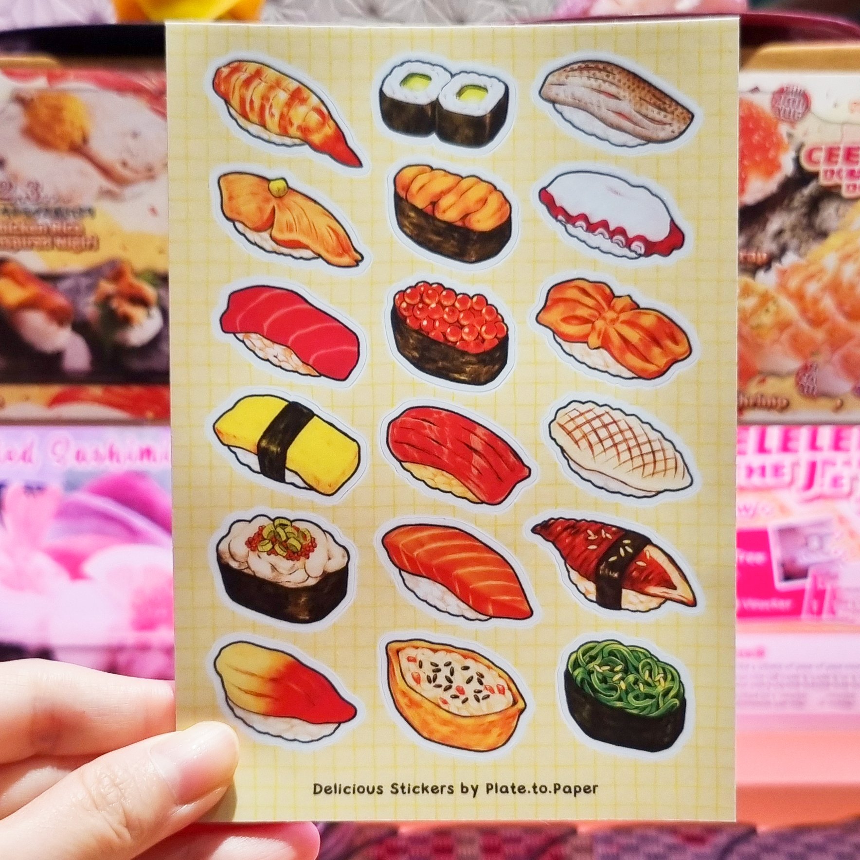 Hand drawn sushi stickers in 18 designs. Yum!